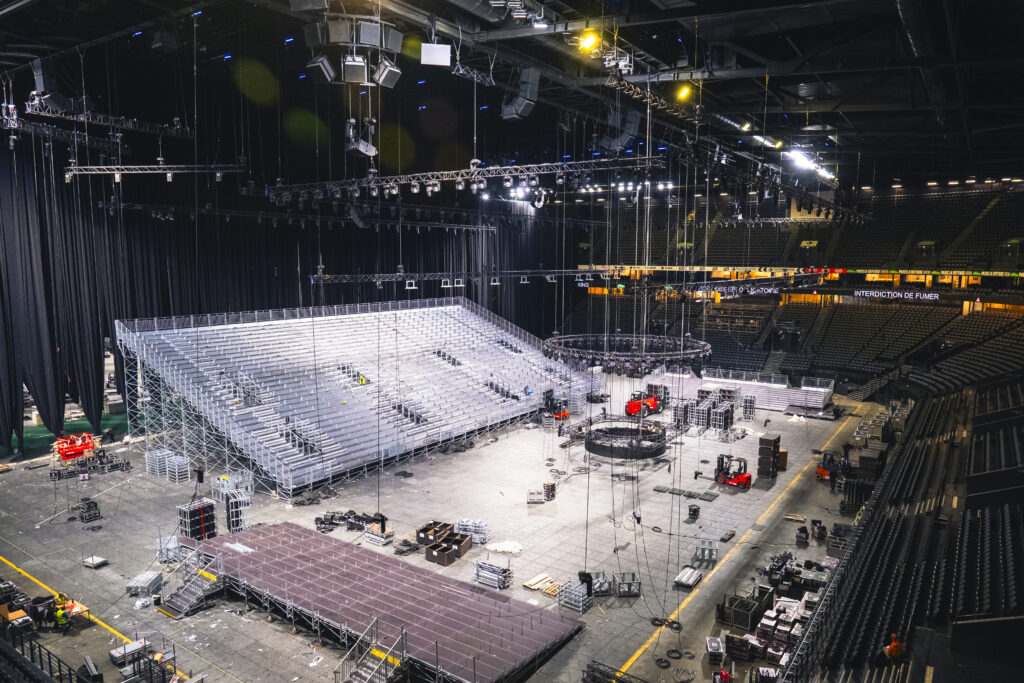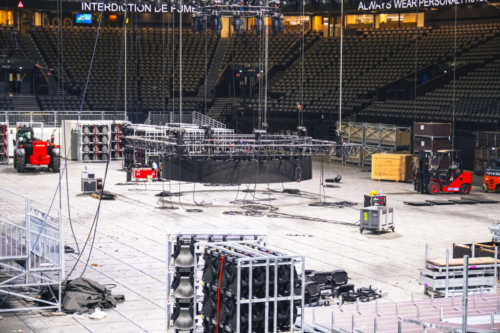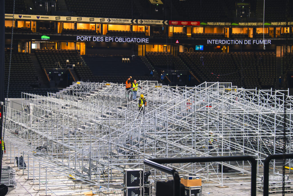 Transformer un site configuré pour un tournoi ATP (court central, tribunes spécifiques, revêtements techniques) en une configuration concert nécessite une opération à très grande échelle. À Paris La Défense Arena, ce « changement de configuration éclair » est rendu possible par :
