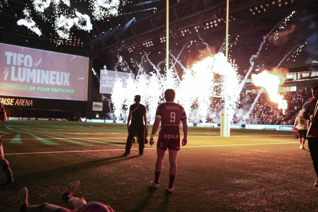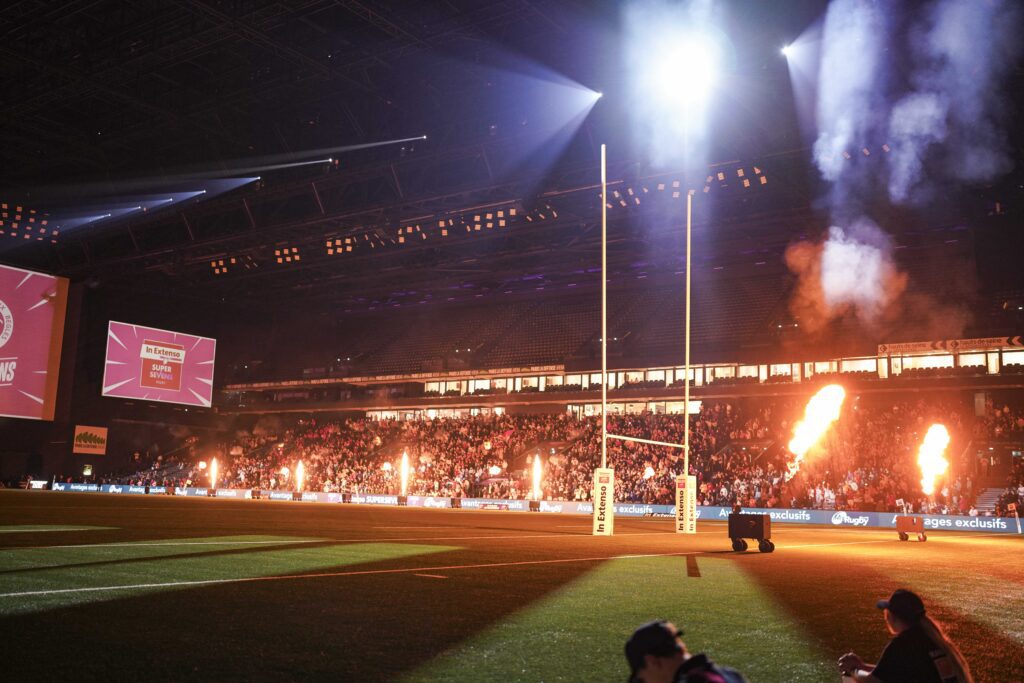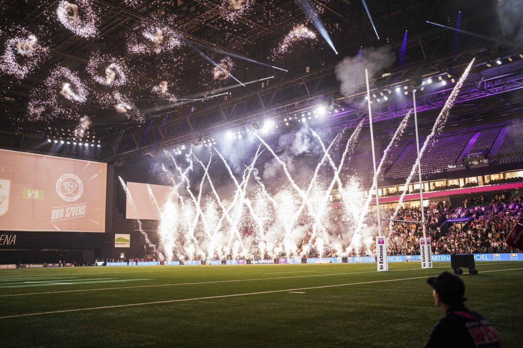 Quelques semaines plus tard, l’arène retrouvait son ADN sportif avec le In Extenso Supersevens, la grande finale du championnat professionnel de clubs de rugby à 7. Huit équipes masculines et plusieurs équipes féminines s’y affrontent dans un format explosif où les essais s’enchaînent à un rythme effréné, parfois toutes les 90 secondes. L’événement transforme la salle en stade de rugby indoor et s’accompagne d’animations et de shows musicaux qui contribuent à créer une atmosphère festive et spectaculaire, fidèle à l’esprit du rugby à 7.