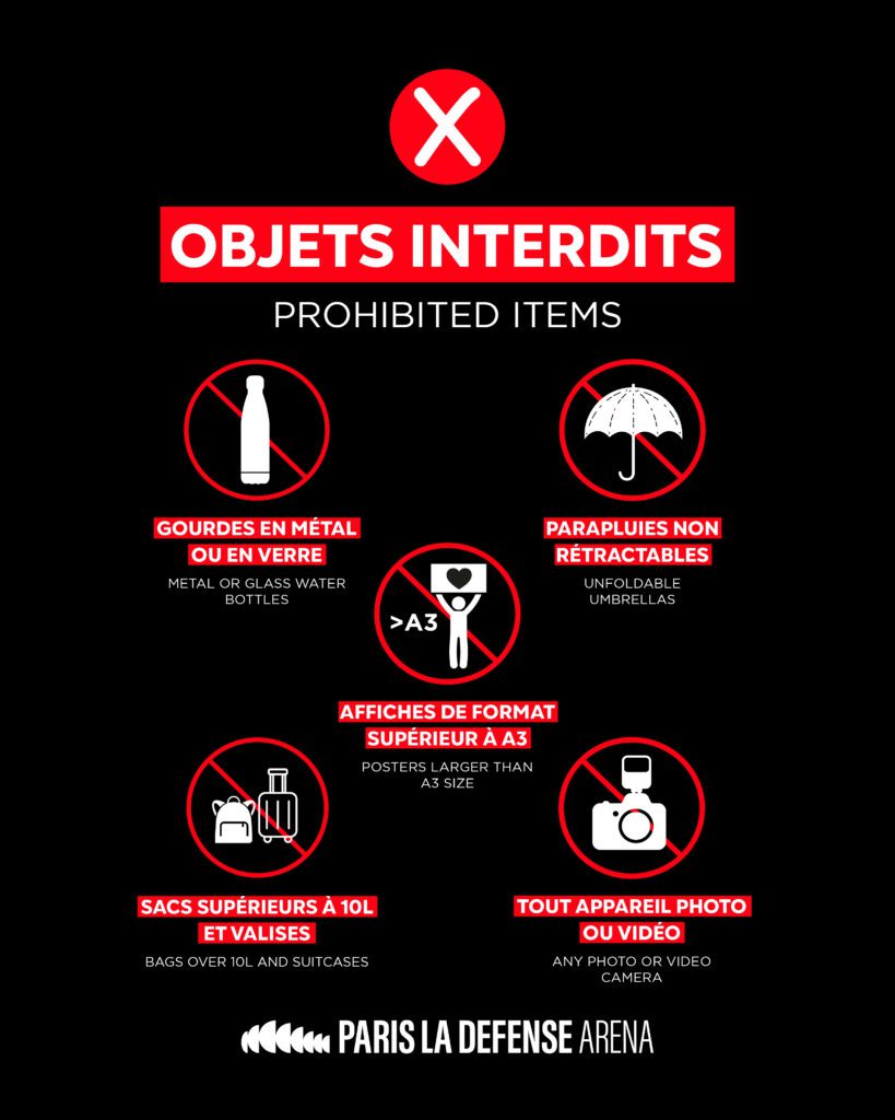 Il est interdit d’introduire dans l’enceinte de Paris La Défense Arena tout objet dangereux et illicite, volumineux, pouvant servir de projectile et pouvant être un danger pour les spectateurs, visiteurs, artistes ou encore pouvant être détournés de leur usage à des fins malveillantes. Ainsi, sont interdits :