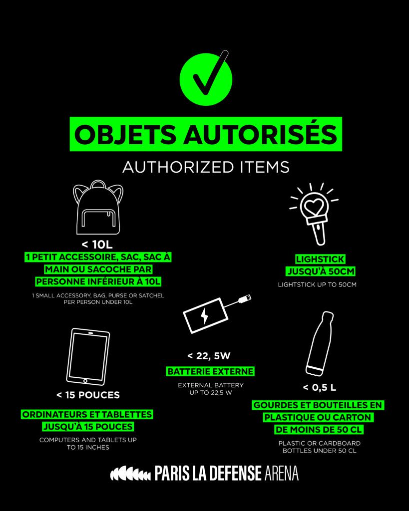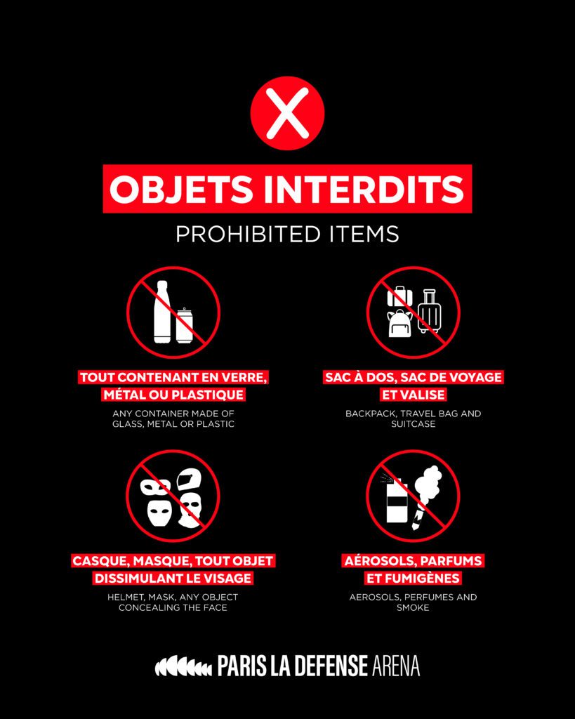 Il est interdit d’introduire dans l’enceinte de Paris La Défense Arena tout objet dangereux et illicite, volumineux, pouvant servir de projectile et pouvant être un danger pour les spectateurs, visiteurs, artistes ou encore pouvant être détournés de leur usage à des fins malveillantes. Ainsi, sont interdits :