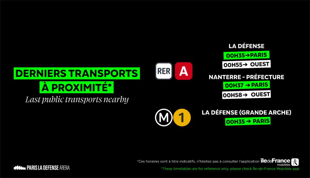 - Vous pouvez vous rendre à Paris La Défense Arena en transports en commun, en vélo ou en voiture.