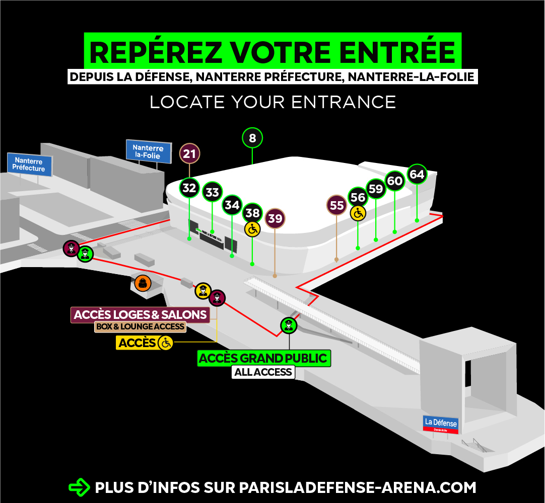 Paris La Défense Arena est accessible en deux roues, le parking se situe côté Nanterre sur la place Nelson Mandela. A noter qu’aucun agent de surveillance n’est prévu. Nous vous conseillons de favoriser les transports en commun qui sont très pratiques.