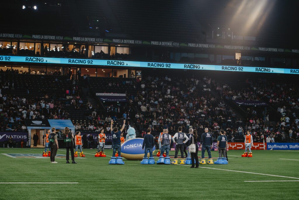 Sur ce match phare du Top 14 à Paris, le partenariat s’est traduit par une activation 360° : branding visible sur le LED ring immersif de 350 m², écrans latéraux, écran nord pour le rugby, animations dans les coursives, animations dans les espaces premium avec dégustation du terroir, organisation de jeux concours et forte implication lors des afters en Bodega.