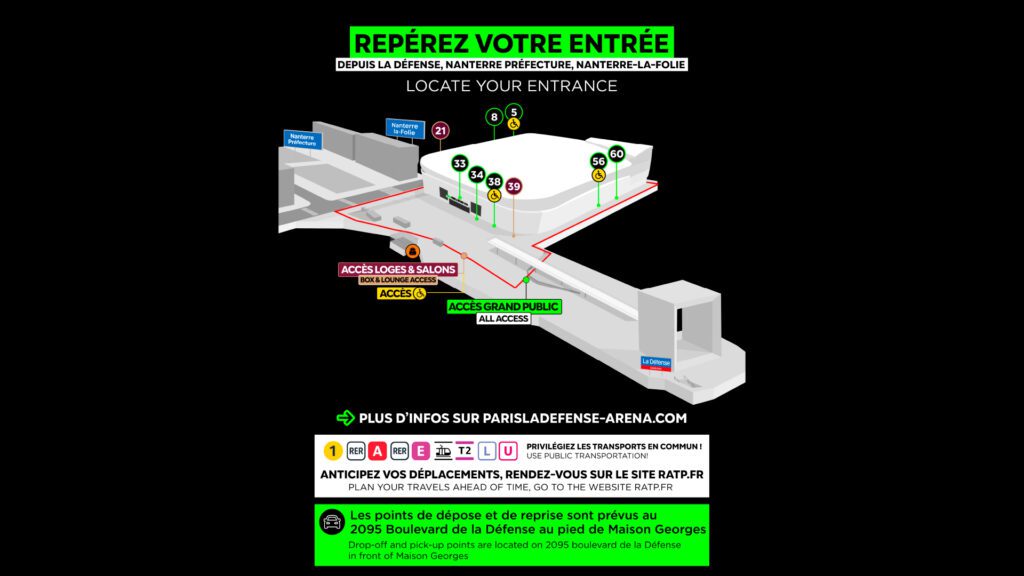 Si vous venez depuis le parking, vous pourrez rentrer par l’entrée 5. N’hésitez pas à faire appel au personnel d’accueil dès votre arrivée. Les spectateurs doivent donc se munir systématiquement de leur carte lors de leur venue à Paris La Défense Arena.
